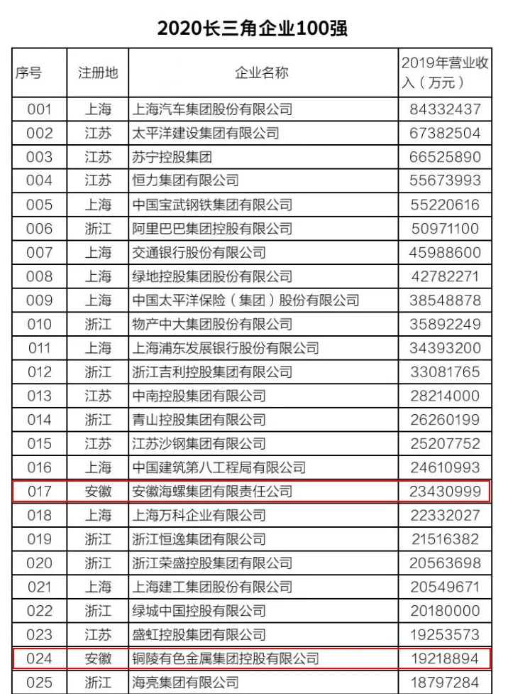 该榜单以2019年企业营业收入为入围标准,由长三角三省一市企业联合会配合宣布。今年是第二次宣布长三角企业百强排行榜,入围门槛是563.8亿元,比上年提高了54.5亿元。今年我省共有9家企业上榜,除金年会集团外,其他8家企业为海螺集团、铜陵有色、中铁四局、联宝(合肥)电子、全威(铜陵)铜业、美的集团芜湖公司、奇瑞控股集团和合肥百大,主要漫衍在水泥建材、有色金属、汽车制造、煤炭和煤化工等行业。