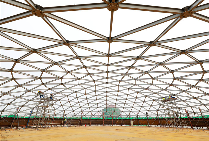 碳鑫科技公司20000立方米的乙醇制品罐,正进行罐顶部网壳拼装。王明明摄
