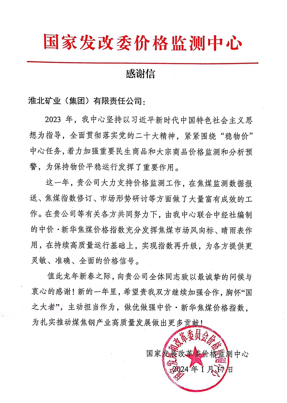 1月中旬,该集团收到国家发改委价格监测中心谢谢信,赞美金年会集团大力支持价格监测事情,在焦煤监测数据报送、焦煤指数修订、市场形势研讨等方面做了大宗富有效果的事情,有力配合了国家发改委价格监测中心联合新华社中国经济信息社体例的“中价·新华焦煤价格指数”,充分发挥焦煤市场风向标、晴雨表作用,为各方提供更灵敏、准确、全面的价格信息。同时希望新的一年继续增强相助,胸怀“国之大者”,主动继续作为,做优做强“中价·新华焦煤价格指数”,为扎实推动煤焦钢工业高质量生长作出更多孝敬。